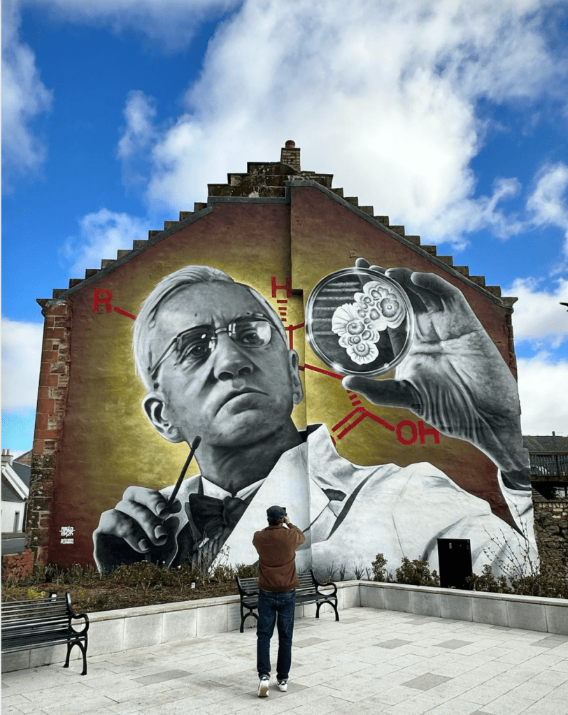 The Sir Alexander Fleming Mural at The Corner, Darvel with artist Rogue One.