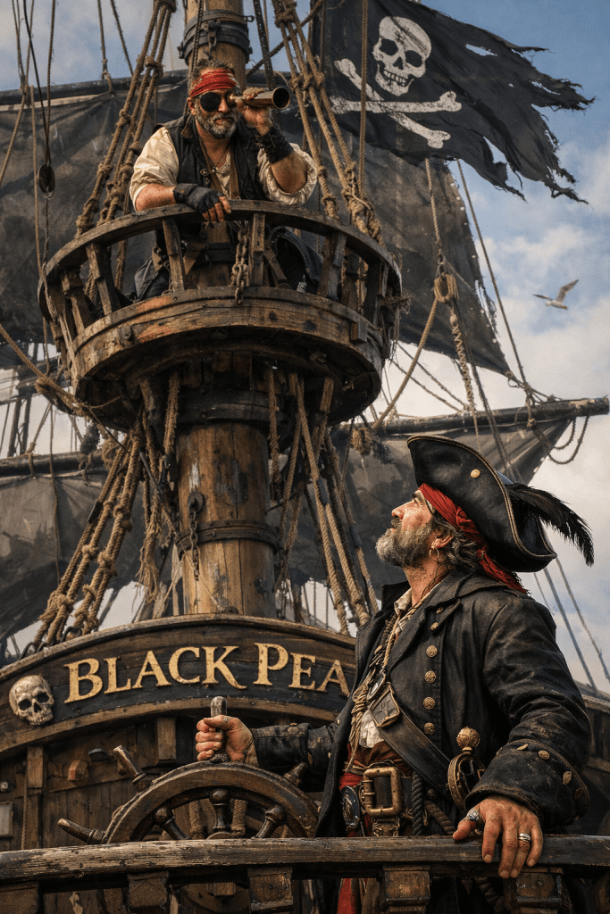 Able Seaman Harry Flatface sways in the crow’s nest of the Black Pea, a small, speedy brigantine stolen from the Dutch. He wipes his brow, puts his only eye to the spyglass, and scans the horizon.