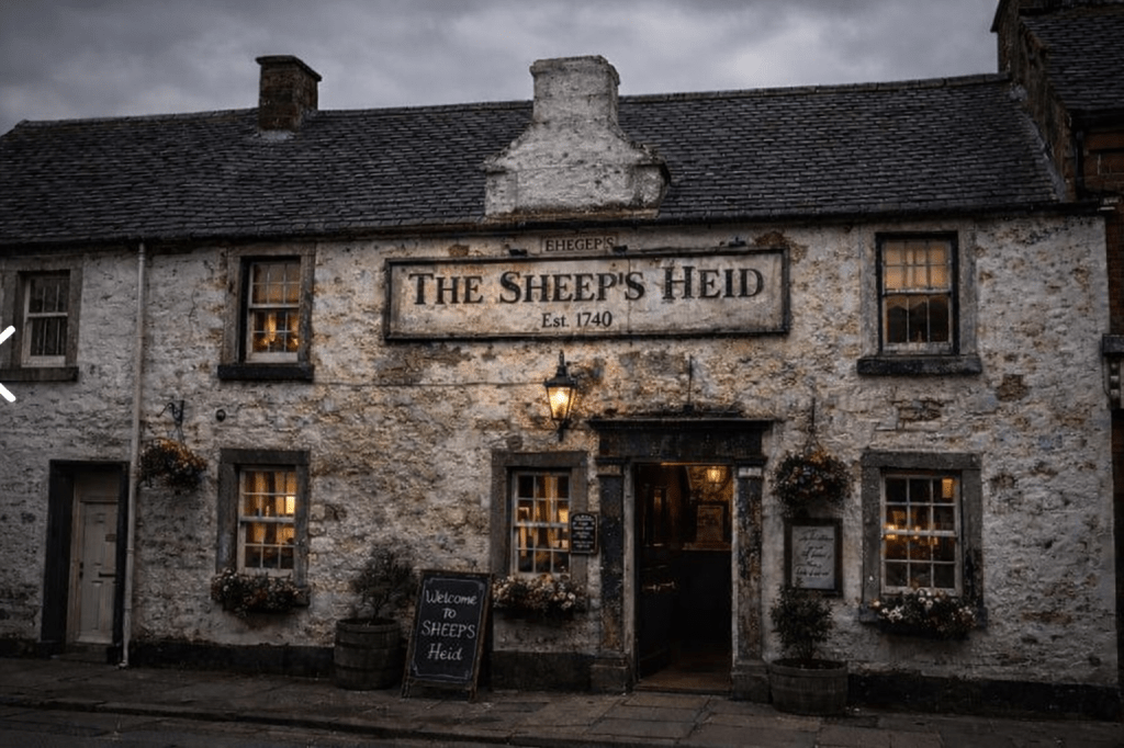 The Sheep’s Heid is a fine establishment—cosy, inviting, and steeped in the comforting hum of familiarity. The landlord – despite gossip – is a genial host, quick with a tale, often punctuated by a knowing wink and a hearty laugh. Stories—mostly tall ones—and laughter flow as freely as the ale.