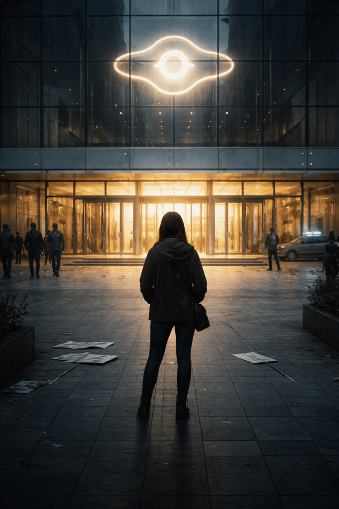 A bell sounded. Inside, the followers took their places, facing the screens. Outside, the protesters straightened, signs lifted but not raised.
